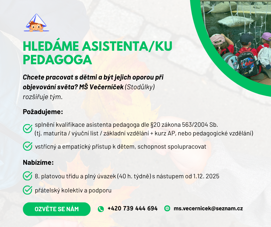 Mateřská škola Večerníček (Praha 13) hledá asistenta/ku pedagoga na plný úvazek (40 hodin týdně) s nástupem od 1. 12. 2025.