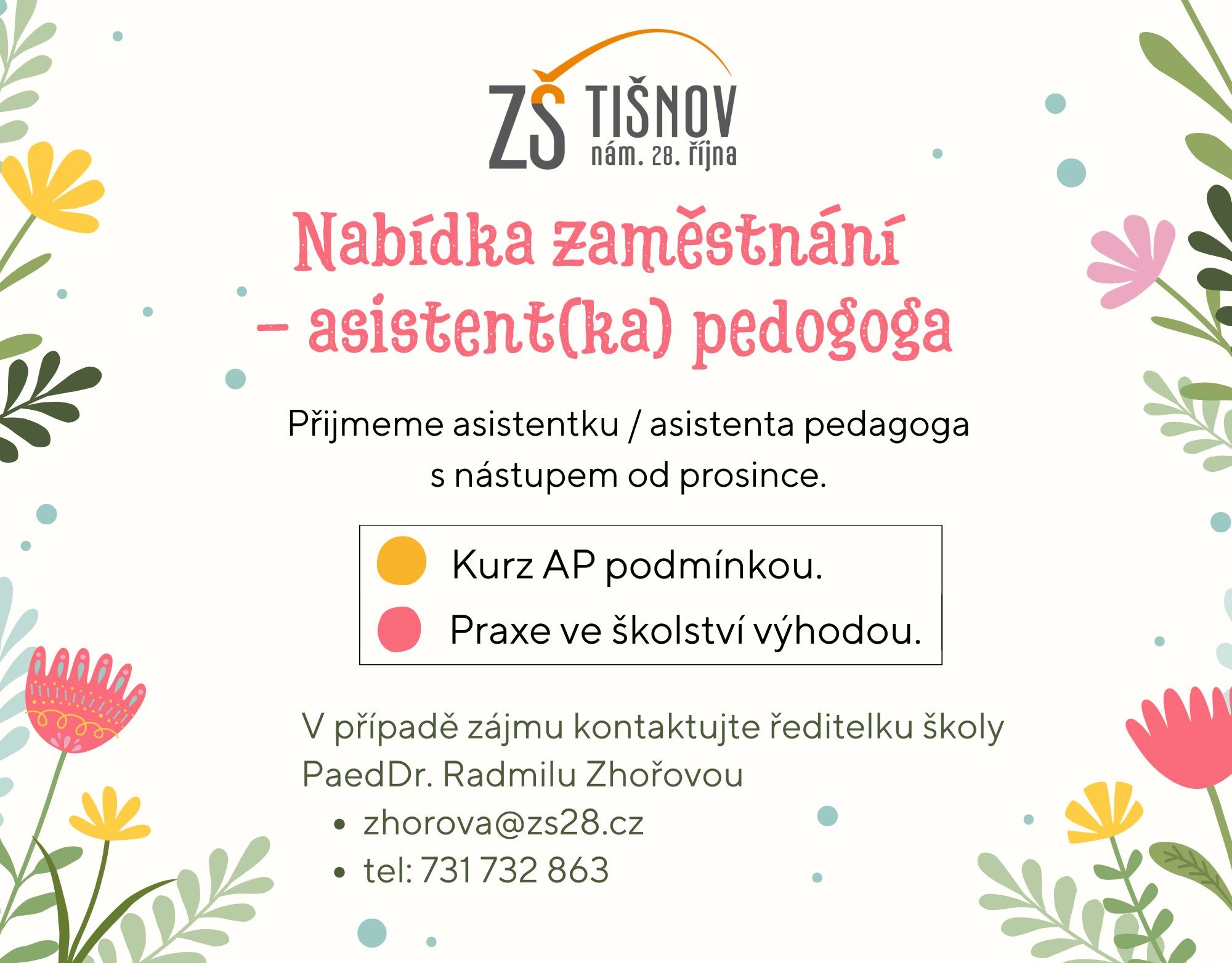 ZŠ Tišnov, nám. 28. října hledá asistenta pedagoga (částečný úvazek)